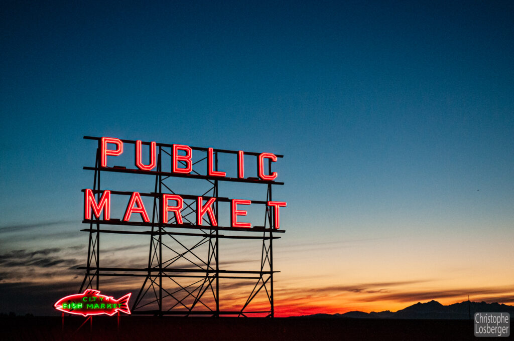 Le soleil brillait encore un peu et j’ai pris avec moi mon Nikon D300, le premier appareil numérique « sérieux » que j’avais acheté quelques mois auparavant pour me remettre à la photo, que j’avais délaissée un peu depuis quelques années. Donc après avoir acheté quelques fringues chez GAP et le soleil commençant de décliner à l’horizon, je suis parti en direction du site touristique le plus proche, le marché aux poissonx de Seattle, le fameux Pike Place Fish Market. Je n’étais à Seattle que pour quelques jours, et malgré mon état comateux du moment, il fallait quand même que j’essaye d’en profiter un peu.